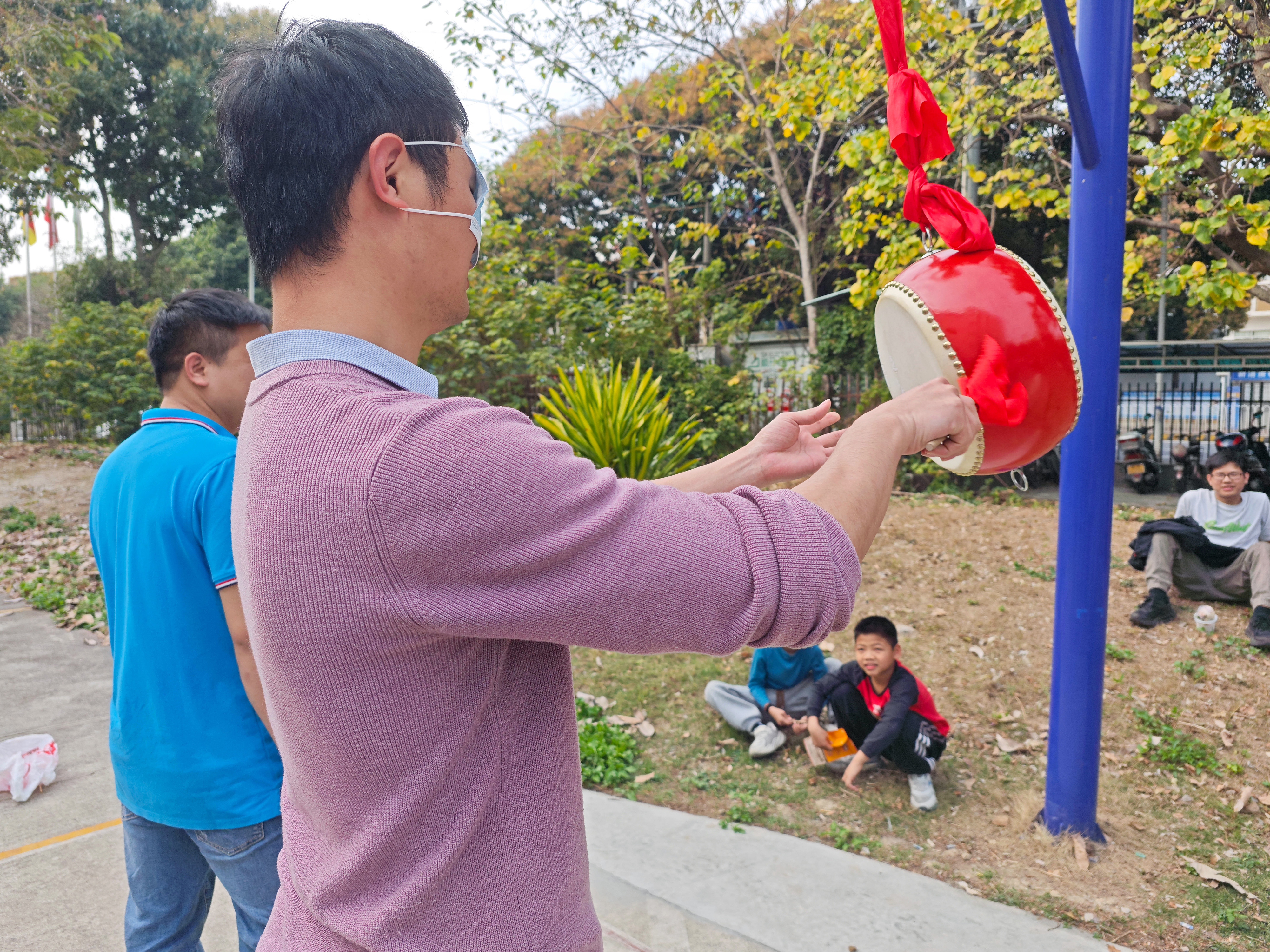原地轉(zhuǎn)三圈后,各位同事手持鼓槌,小心翼翼地朝著前方懸掛的鼓摸索前行。